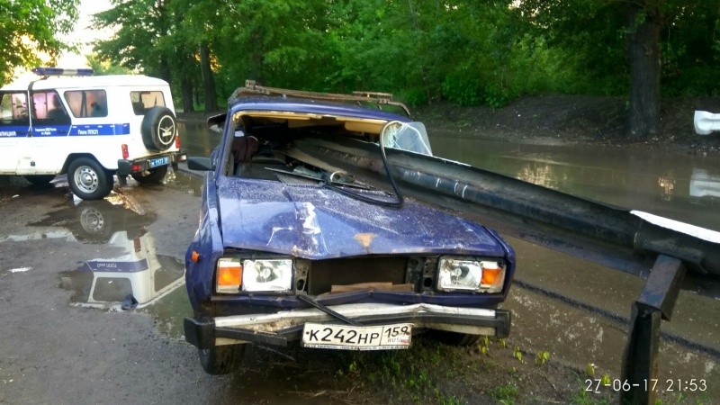 В Перми водитель легковушки чудом выжил после того, как заграждение пробило его авто насквозь.