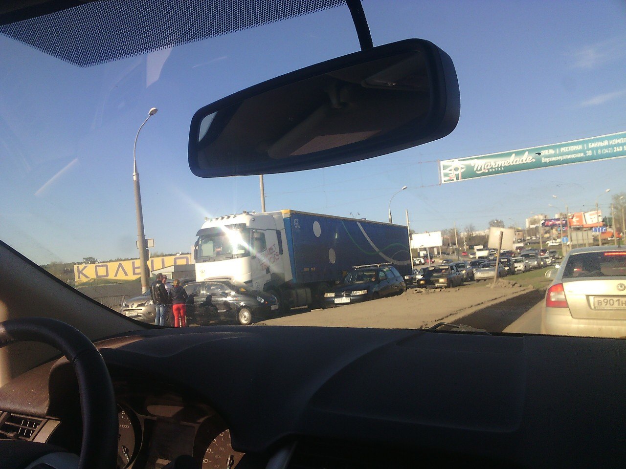 Очевидцы сообщают об аварии на шоссе Космонавтов: тягач с прицепом врезался в малолитражку Daewoo Matiz. К счастью, пострадавших нет, но автомобили перегородили почти две полосы. Движение из города в сторону аэропорта «Большое Савино» до сих пор затруднено в районе поворота на деревню Кондратово. Пробка растянулась почти от Ипподрома.