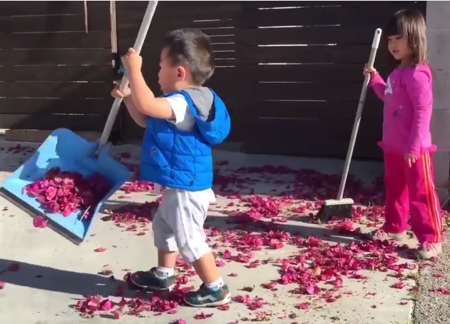 Маленькие брат и сестра помогают родителям и друг другу с уборкой двора: девочка подметает опавшие цветы, а мальчик носит все это в мусорку. В теории звучит, конечно, отлично, но на практике…