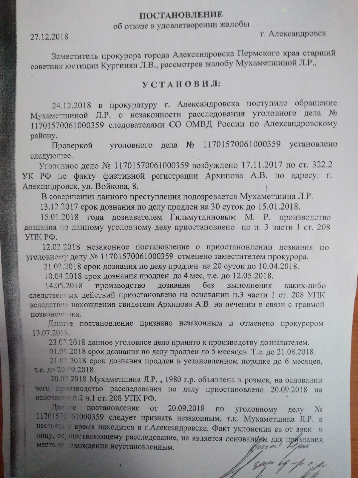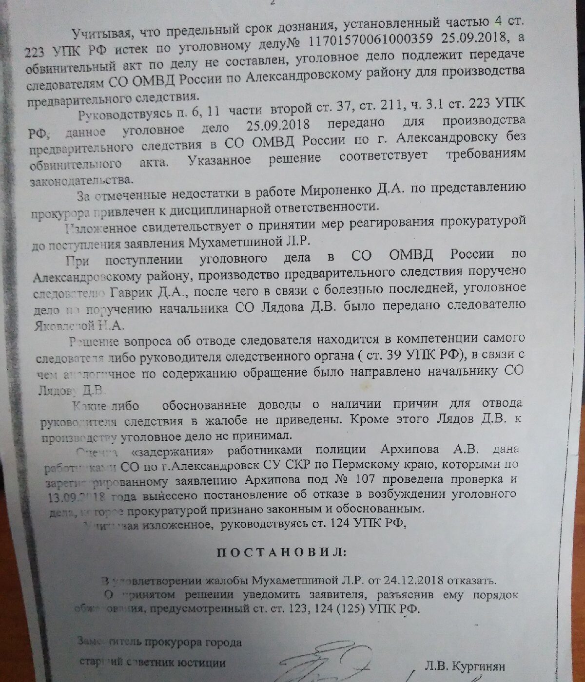 О незаконности возбуждения уголовного дела женщина заявила в прокуратуру, но там она наткнулась на друга И. Заместитель прокурора Кургинян Л. В. отказала в удовлетворении жалобы, не приняв во внимание факт супружества.