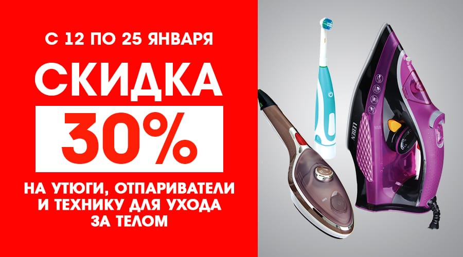 Кто на Новый год дал себе обещание больше заниматься собой – своим здоровьем и внешностью? Сдержать его каждому по силам, а поможет в этом народный магазин «Галамарт». По 25 января здесь будет действовать скидка -30% на технику для ухода за собой, а также утюги и отпариватели. Можно и для себя необходимыми вещами запастись, и подругам подарки купить на будущие праздники.