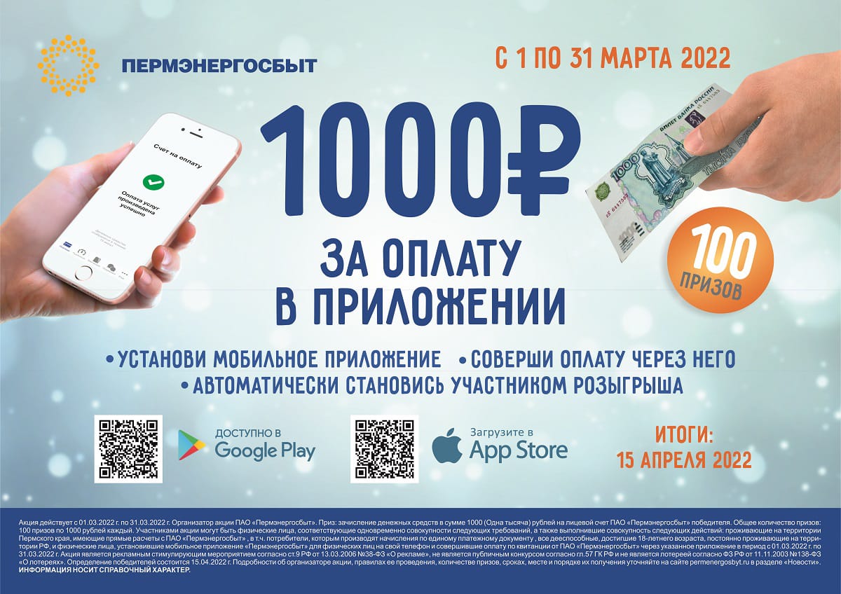 ПАО «Пермэнергосбыт» продолжает акцию «1000 рублей за оплату в приложении». Акция продлится до 31 марта, принять в ней участие может любой житель Пермского края, получающий квитанции от ПАО «Пермэнергосбыт».