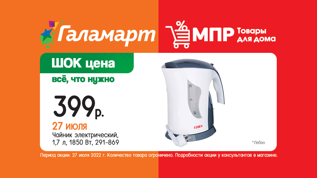 26 июля утюг с отпаривателем LEBEN обойдется вам по ШОК-цене в 399 рублей, а на следующий день приходите за электрическим чайником, который 27 июля будет стоить также 399 рублей. Домой или на дачу – прекрасный вариант: все-таки посидеть вечером на веранде с чашечкой горячего чая – настоящее удовольствие.