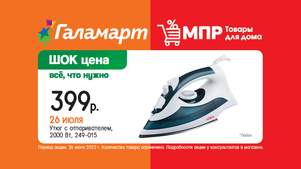 Покупайте с выгодой и хорошим настроением: народные магазины «Галамарт» и МПР об этом позаботятся! Кстати, различные акции действуют здесь постоянно: на посуду и технику, текстиль и игрушки, инструменты и канцелярию, а в ассортименте несколько тысяч товаров, так что вы без труда подберете себе все, что нужно.