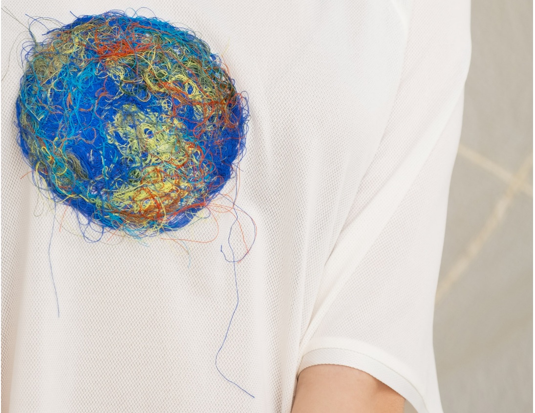 Для создания необычной футболки с принтом в виде планеты дизайнер использовала ламинированные нити. Эту технику Полина Кельдибекова создала сама в 2017 году. Принт каждый раз выкладывается вручную и не повторяется.