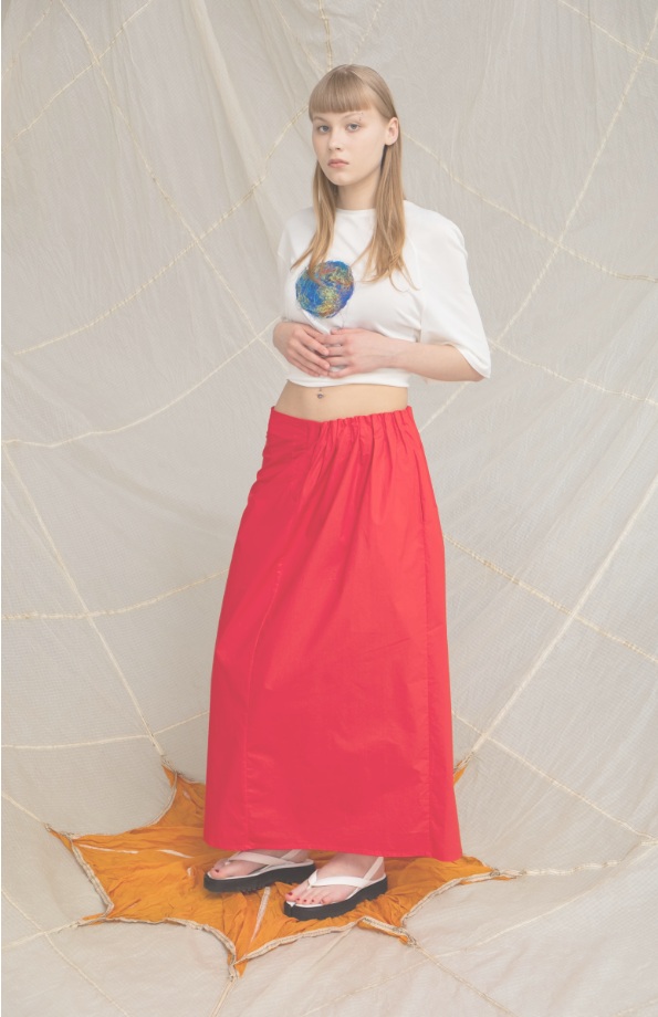 Например, одна из любимых вещей дизайнера – длинная красная юбка из тонкого вощёного хлопка. На первый взгляд простая длинная юбка. Но она из двух половин разного кроя: одна – прямая, прилегает по бедру, вторая – пышная, воздушная, с поясом – резинкой, без швов, но с карманом.