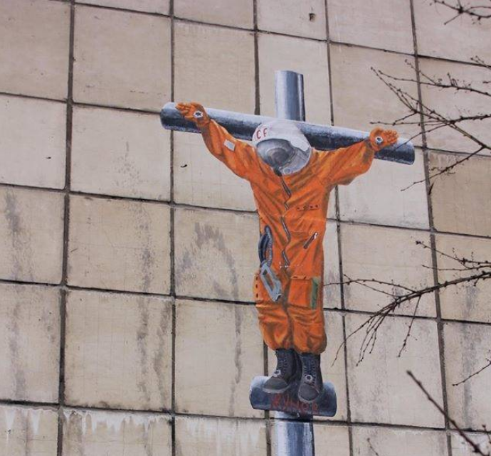 Одной из самых популярных работ стало изображение «распятого Гагарина». Оно появилась на перекрестке улиц Советской и Куйбышева 12 апреля 2015 года. Работа была выполнена с помощью акрила, бумаги и клея. За это граффити Александр получил премию «Российское активистское искусство».