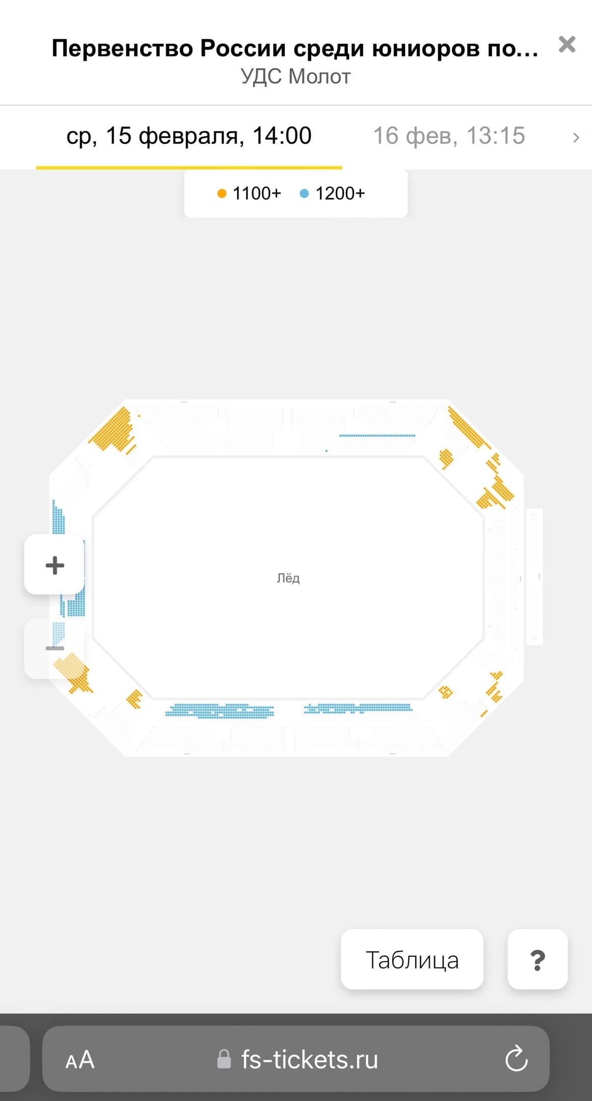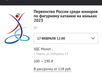 На одном из консьерж-сервисов во всю продаются билеты на Первенство России по фигурному катанию, которое пройдет в Перми с 15 по 17 февраля. Как выяснил корреспондент «В курсе.ру», перекупщики отдают места в УДС «Молот» за 1000-1200 рублей, когда на официальном сайте билеты стоят до 200 рублей.