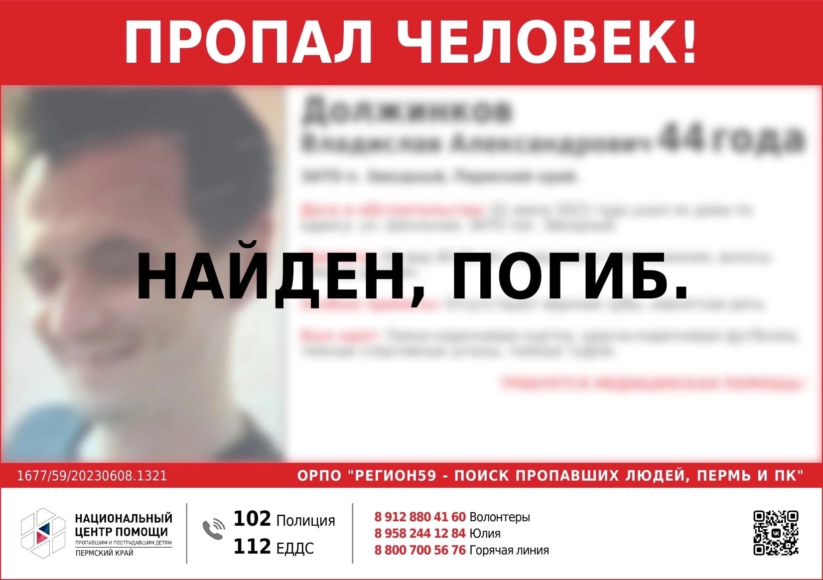 В ЗАТО Звездный нашли погибшим 44-летнего Владислава Должинкова. О месте нахождения мужчины было ничего неизвестно с 1 июня. Об этом сообщает поисковый отряд «Регион-59» в своих соцсетях.