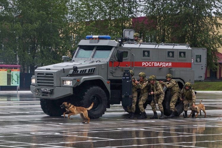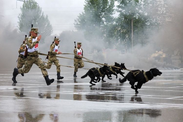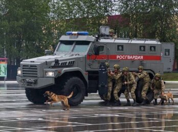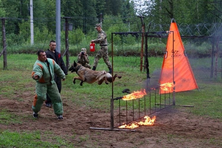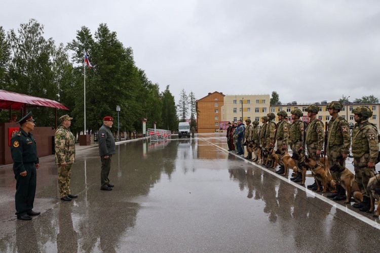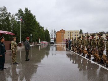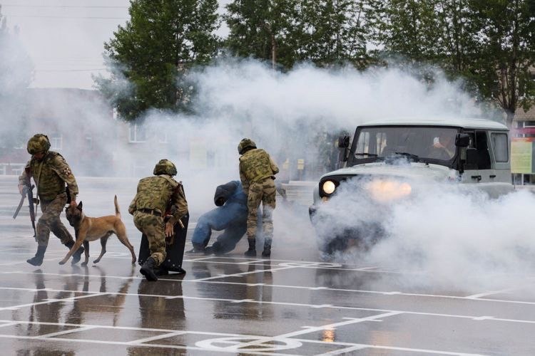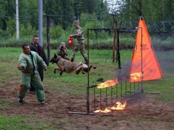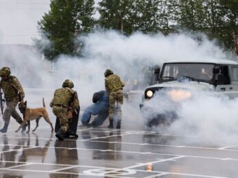 Курсанты кинологического факультета провели показательное выступление, продемонстрировав задержание условных преступников с использованием свето-шумовых эффектов, бронетехники и БПЛА.