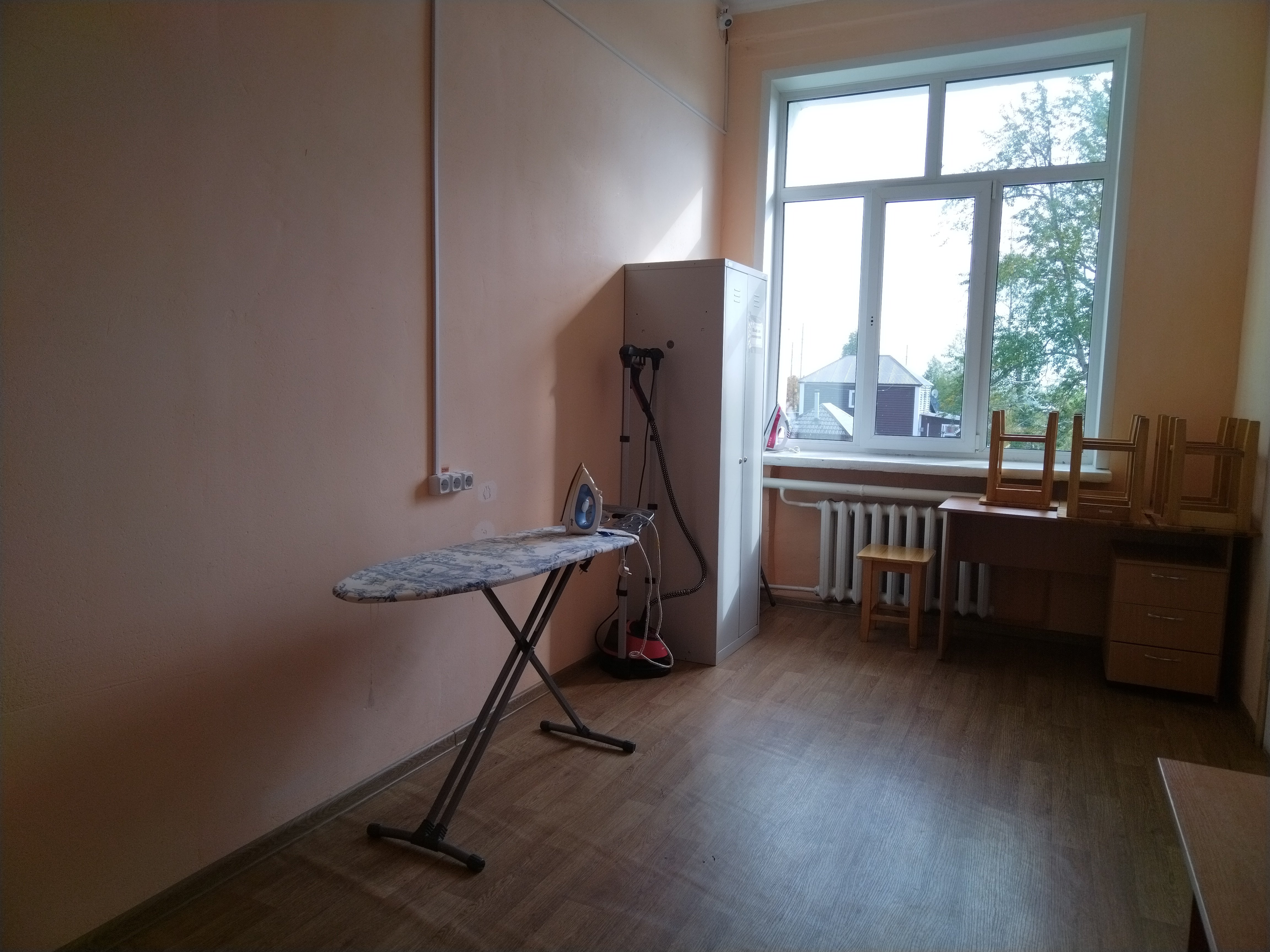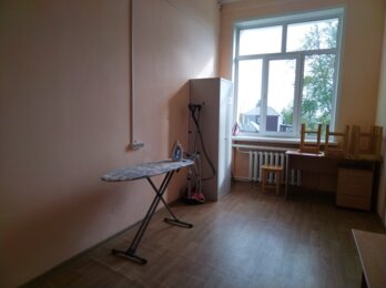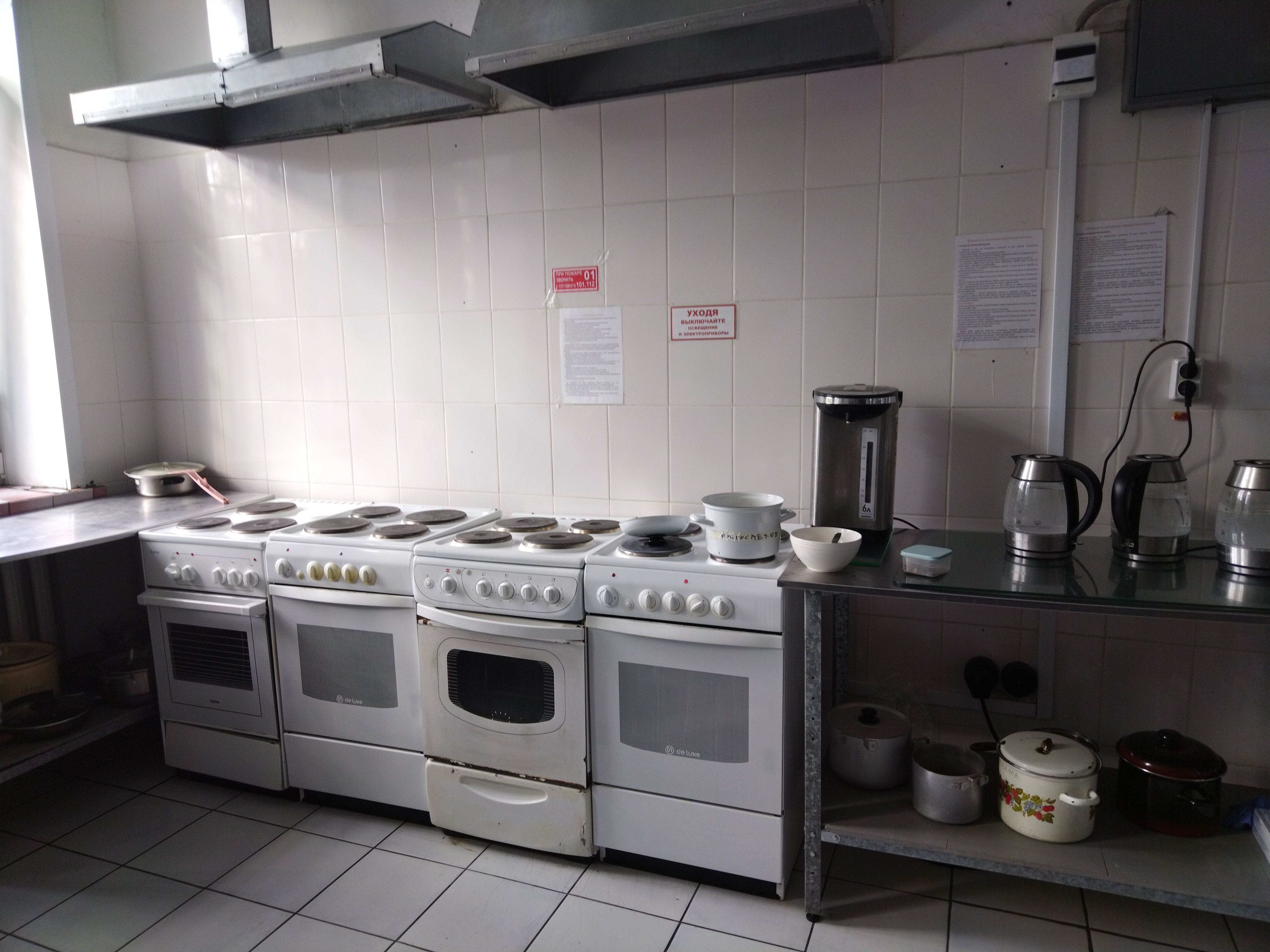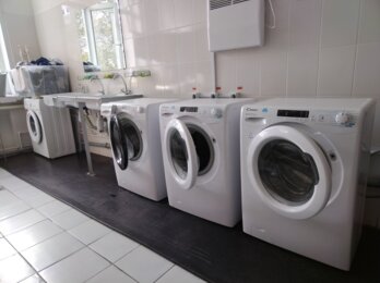 Заглянули в кухню. Каждый готовит себе сам. На стеллажах – ящики с овощами, в холодильнике – кастрюли, продукты. Есть плиты, микроволновки, электрические чайники. Рядом – прачечная. Стоят стиральные машинки, сушилки для одежды, доска, утюг.
