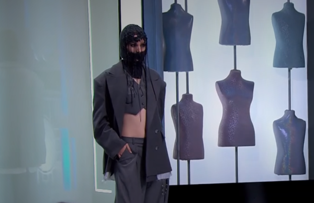 На подиум вышли модели в одежде, которая сочетает в себе нарядные вещи, к примеру, черное платье с воланами и корсетом, так и офисный стиль: пиджаки, брюки и т.д.