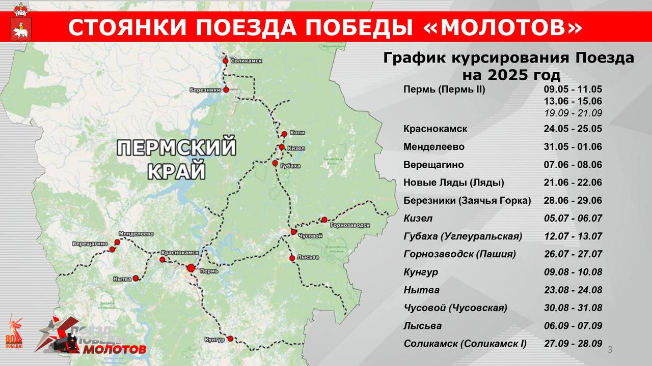 В День Победы в Прикамье начнет курсировать уникальный поезд «Молотов». В графике остановок, который утвердили на оргкомитете по подготовке к празднованию юбилея Великой Победы, 14 городов.