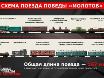 Мы уже писали об этом флагманском проекте в год 80-летия Победы. Поезд будет состоять из десяти объектов: паровоз П-36 «Генерал», платформа с промышленными станками, бронеплатформа ОБ-3, платформы с техникой А-19 и МЛ-20, цистерна ГСМ и четыре вагона с внутренней экспозицией: крытый стилизованный под эвакуацию заводов вагон, вагон Памяти, вагон аптека-перевязочная и вагон штабной ВСП. В последнем также расположится лекторий.