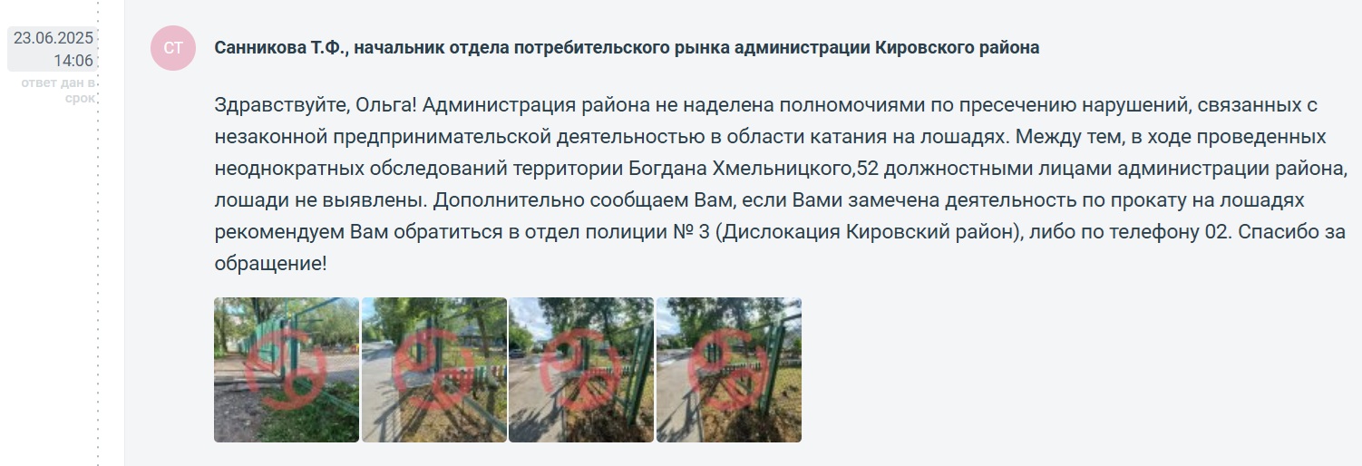 Почти на все жалобы ответы от районных властей похожи, иногда даже слово в слово. После получения жалобы работники администраций в рандомно выбранное время выходят на указанный адрес и лошадей не видят. Фотографируют вход в детский сад без лошадей и сообщают, что животные не выявлены. Перед этим обязательно добавляют, что вообще-то сотрудники районной администрации и не должны следить за этой ситуацией: