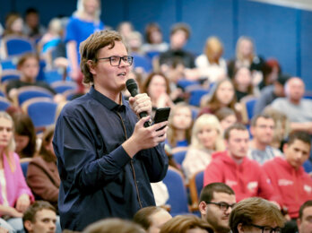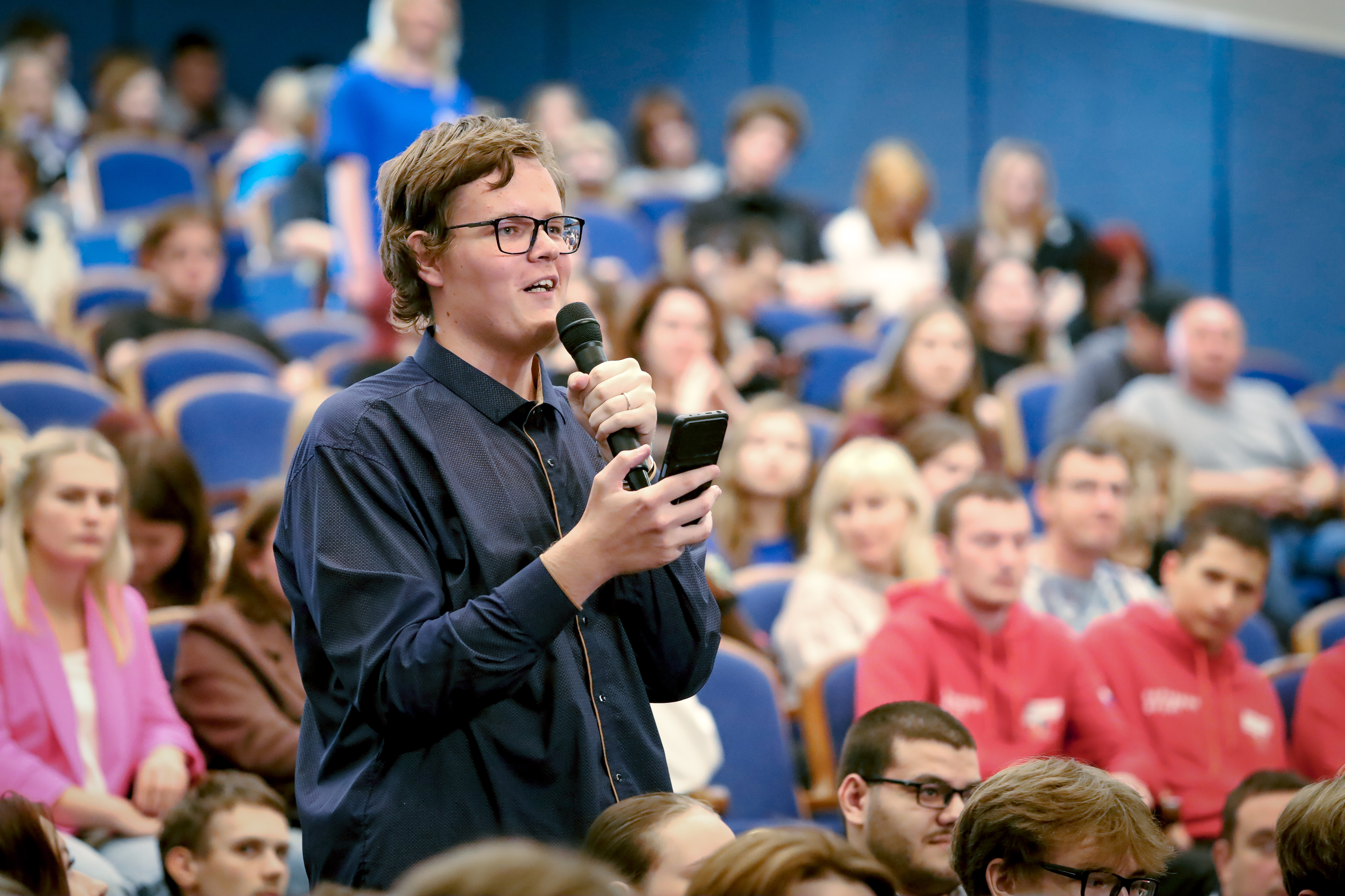 Бурную реакцию у зала вызвал вопрос девушки в черной футболке о нецензурной лексике как о сохранении русских ценностей.