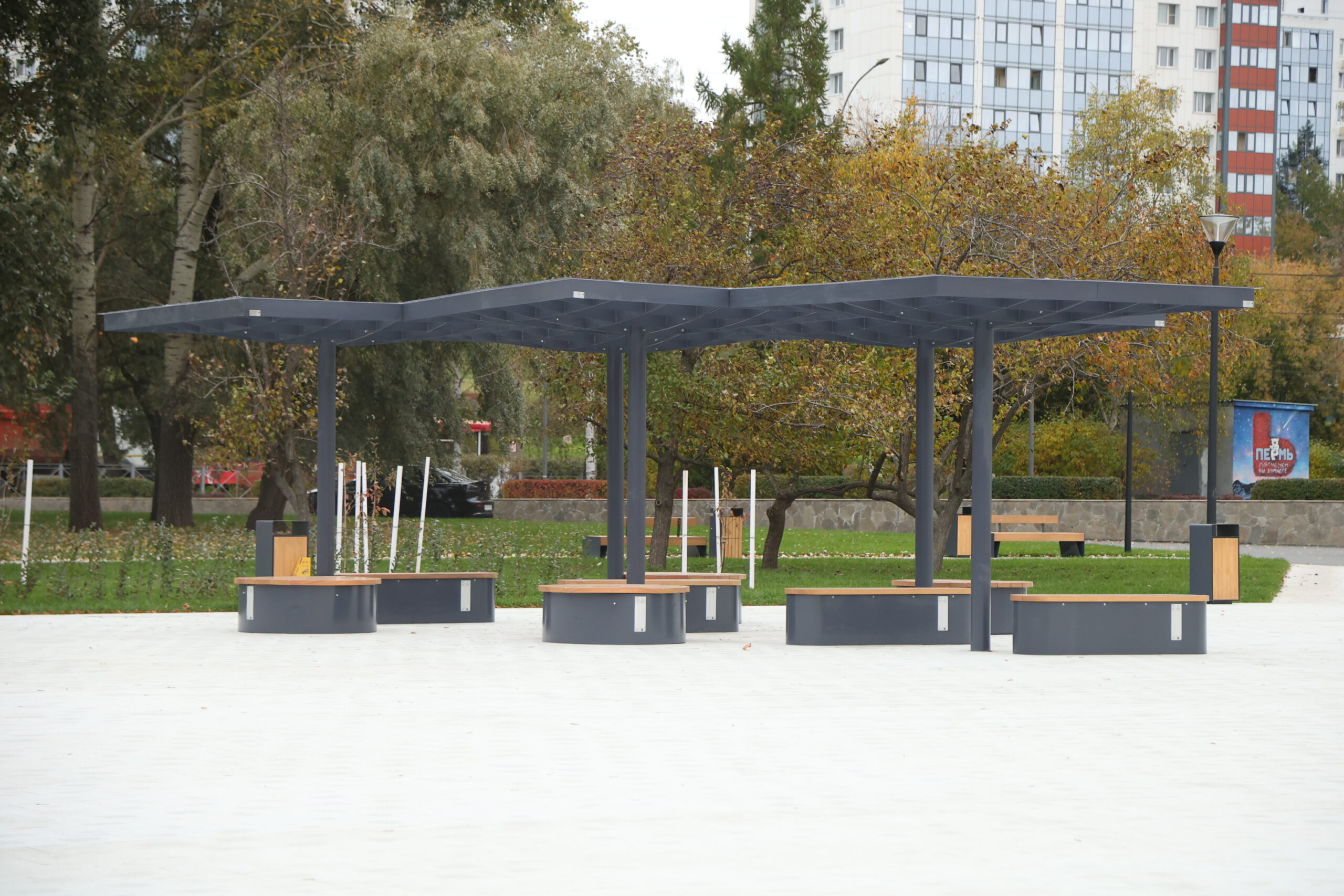 В самом сквере подрядчик обустроил новые пешеходные дорожки, обновил асфальтобетонное и плиточное покрытия, отремонтировал систему освещения. Также, в новом пространстве восстановили газон и высадили деревья и кустарники. Здесь также провели работы по монтажу сцены и установке малых архитектурных форм. Одна из них – парклеты. Это конструкция зоны тихого отдыха со столами, сидениями и навесом, где имеются гирлянды. Они служат дополнительным освещением в вечернее время.