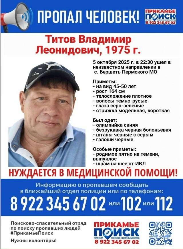 Всех, кто располагает какой-либо информацией о местонахождении Владимира Титова, просят сообщить в по телефонам: 8 922 34567 02 или 112.