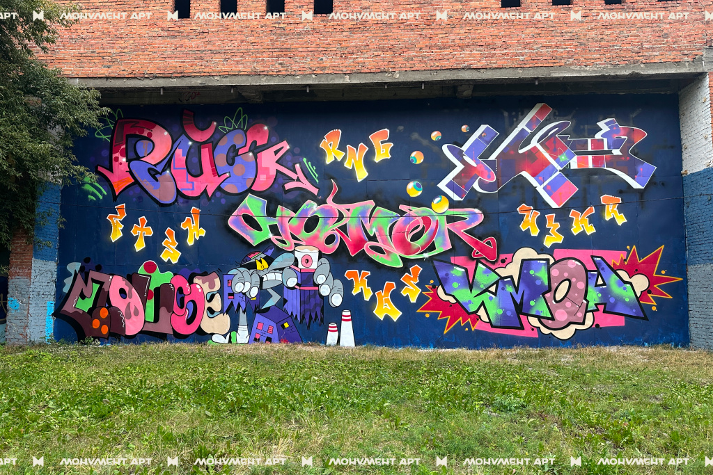 Еще одно граффити — коллективная работа граффити-райтеров (Адрес: Комсомольский проспект, 34Б). Арт-объект выполнен в формате классического граффити Hall of Fame. Над его созданием одновременно работали пять граффити-райтеров из разных городов России. Каждый художник создавал собственный фрагмент композиции, что позволило добиться уникального визуального эффекта и продемонстрировать многообразие стилей современной уличной культуры.