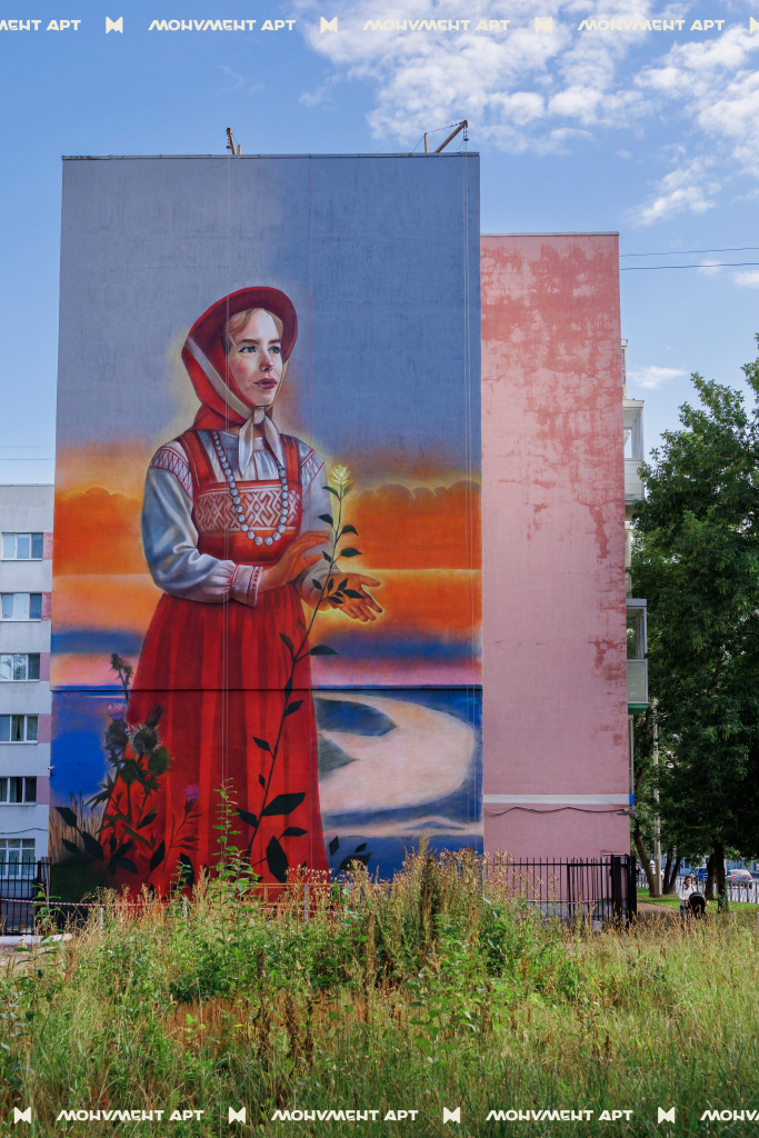 Образ девушки в национальном костюме, олицетворяющий глубокую связь с природой и традициями предков. Работа основана на местных преданиях о гармонии между человеком и окружающим миром. Вдохновением для мурала стала солистка пермского ансамбля «Воскресение» Полина Калинина.