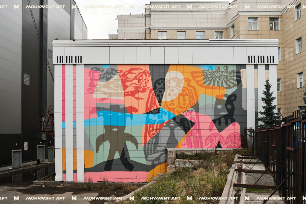 Мурал посвящен Пермскому звериному стилю – уникальной художественной бронзовой металлопластике, наследию прикладной металлургии средневековой цивилизации Урала VI–XII вв. н.э. Художник изобразил бронзовые артефакты из архива Пермского краеведческого музея (пронизки, накладки и подвески в форме животных), объединив их в единый сюжет с авторскими персонажами.