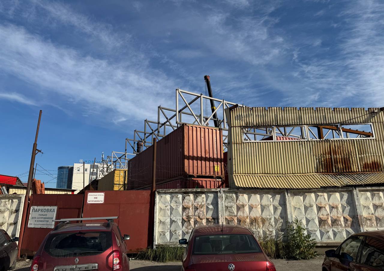 В Перми на месте сгоревшего склада сантехники на Шоссе Космонавтов, 395б, начали строить новое сооружение. При этом в качестве опорных стенок используются грузовые контейнеры. Внимание на это обратили читатели v-kurse.ru.