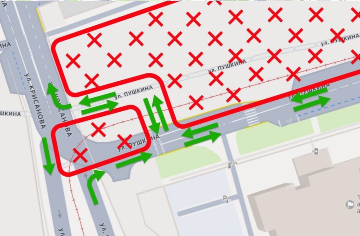 Объезд будет организован по новому участку дороги на улице Пушкина, информация о котором представлена на схеме.