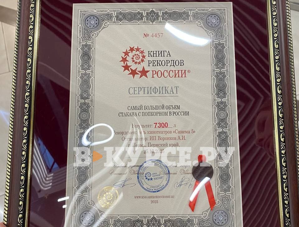 В Перми 25 октября в ТРК «iMall ЭСПЛАНАДА» установили рекорд по самому большому стакану попкорна. Результат зафиксировали члены комиссии Книги рекордов России. Его высота составила 2,5 метра.