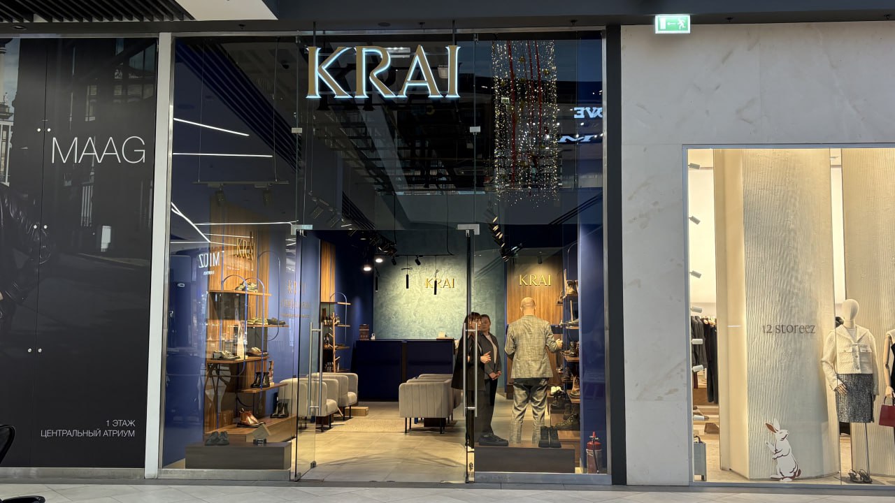 Магазин занимает помещение площадью 59 квадратных метров на первом этаже торгового центра. Бренд KRAI специализируется на мужской обуви и аксессуарах ручной работы. Также в ассортименте представлены средства по уходу за изделиями.